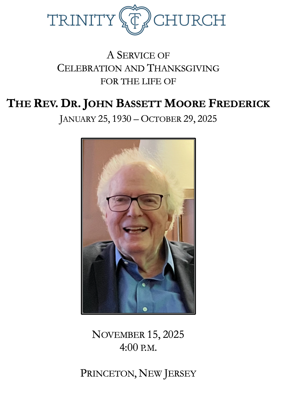 November 12, 2025 Trinity Communications News Memorial Service: The Rev. Dr. John Bassett Moore Frederick November 12, 2025 Trinity Communications News A SERVICE OF CELEBRATION AND THANKSGIVING FOR THE LIFE OFThe Rev. Dr. John Bassett Moore Frederick(January 25th, 1930 - October 29th, 2025)Please join us:📍Trinity ChurchNOVEMBER 15th 20254:00PM Trinity Communications